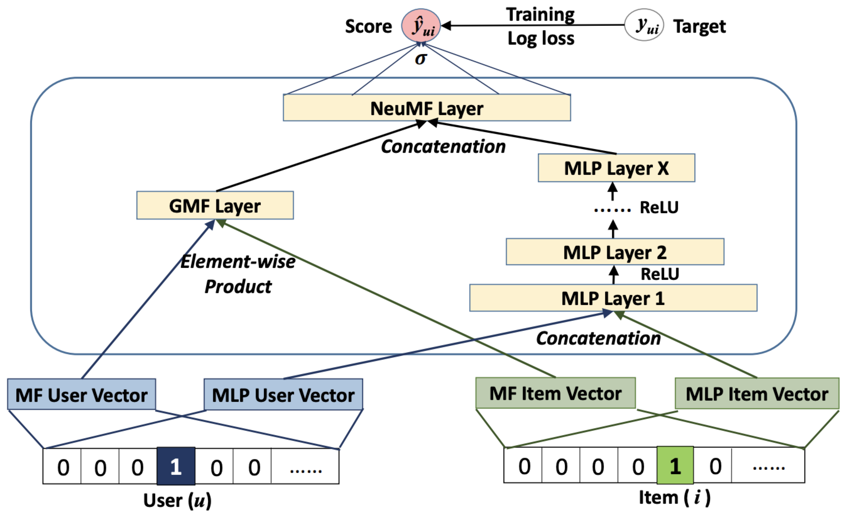 - Neural Matrix Factorization (NeuMF): concatenates the outputs of GMF and MLP, applies a projection layer and sigmoid